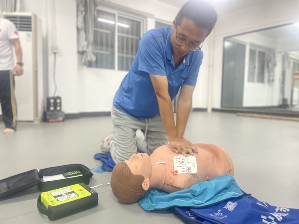 理论讲解结束后,训练馆的空地瞬间变成了“急救模拟场”。2台AED设备和2具急救模拟人整齐排列,窗外暴雨敲打着玻璃,发出噼里啪啦的声响,而馆内却是一片专注的景象。教师们分成两组,轮流扮演“施救者”,进行实际操作练习。