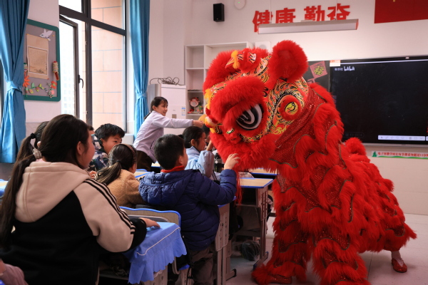 随后的舞狮表演将气氛推向高潮。由4名大学生扮演的两只“狮子”活灵活现,穿梭于课桌之间,孩子们笑声不断,纷纷上前与“狮子”亲密互动,现场气氛热烈。