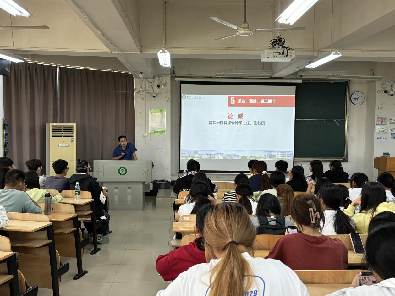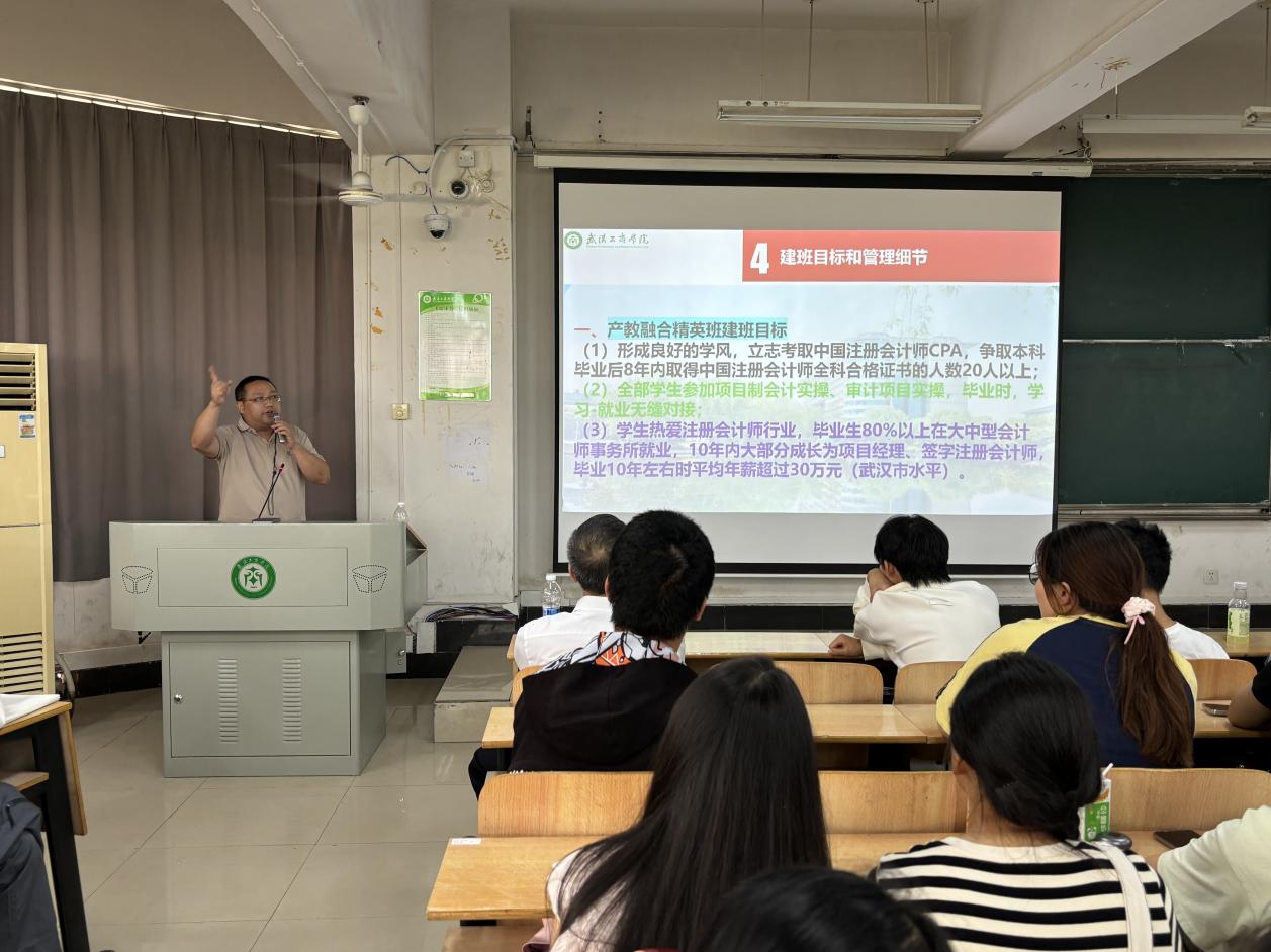 其次,管理学院常务副院长聂新田教授详细讲解了产教融合CPA精英班组班背景、意义及管理办法等,学校一直致力于“产教融合、协同育人”的人才培养新模式,2022年5月管理学院与知名会计师事务所合和(武汉)会计师事务所(特殊普通合伙)签订战略合作协议,共建产教融合CPA精英班。以注师进课堂、“2+1+0.5+0.5”学制、核心岗位实训等培养模式为学生提供优质课堂、实习实训支持和就业保障,让学生清晰了解产教融合培养的教学优势及实践特点。