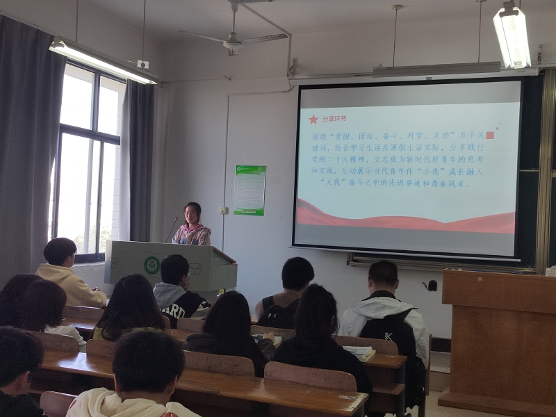2022级各十一个班的同学们从踏实做事、勤恳干事、为党争辉、诚信为人等方面分享了寒假参观博物馆、帮助老人干活和照顾弟妹家人等的感悟。黄舜宇同学讲述了自家亲戚在疫情开放封控期间按原价销售药品,不趁机哄抬价格,以小见大从社区团结到国家各民族团结;陈乐同学讲自己在寒假期间联系好友互助运动科学健身,保持良好身体状况;蔡瑾缘同学分享了寒假看《狂飙》所感受到的国家扫黑除恶的决心,加深了爱国情怀,同时对奋斗有了自己的理解;帅婕同学寒假期间每天坚持早6点半出门练车到晚7点,坚持不懈努力,不到1个月就拿到通过了驾照考试,由此明白了奋斗的内涵……始终听党话,跟党走,感恩党,不忘初心,展现了新青年的风采。