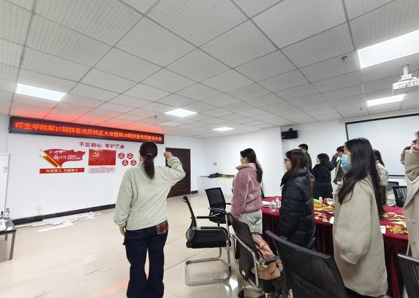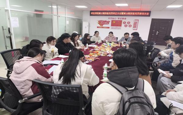 2024年12月4日中午 ,环生学院于综合楼1118室隆重举行第19期预备党员接收大会、第17期预备党员转正大会暨学生党支部年度总结茶话会。此次会议参加人员有环生学院党总支副书记王强、学生党支部书记何丹、24 级辅导员王雯瑄,以及第19期发展对象、第17期预备党员及全院学生正式党员。