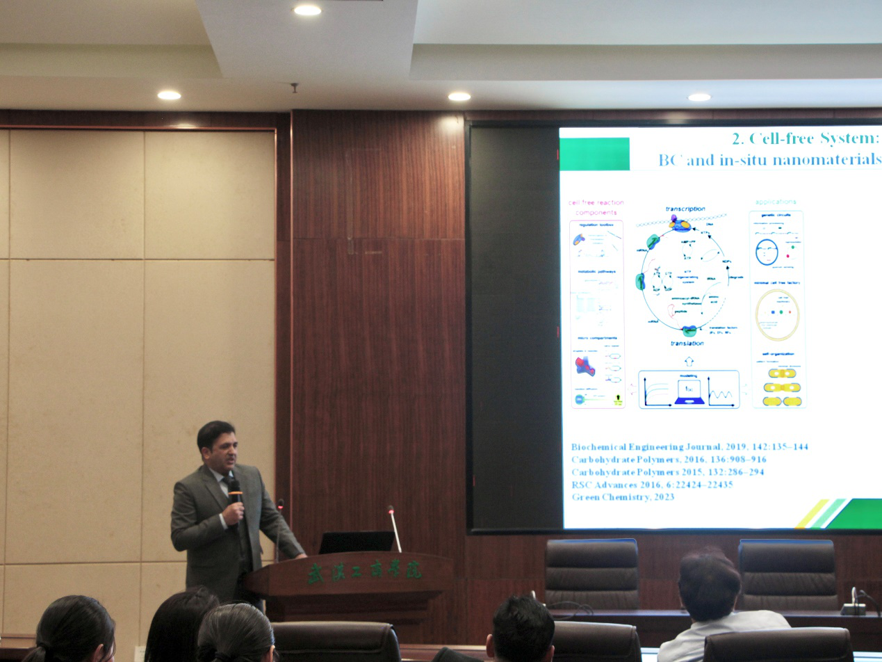 讲座伊始,Wajid Ullah博士以“自然界的纳米工程师”为喻,生动阐释了细菌纤维素的结构特性与合成机制。他通过电子显微镜下的微观影像,展示了细菌纤维素如“天然编织网”般的精密三维结构,并强调其在生物相容性、可降解性及机械强度上的独特优势。结合团队最新研究成果,博士系统梳理了细菌纤维素在创面修复、柔性电子传感器、环保包装材料等领域的应用突破,提出“以自然之道解决人类可持续发展难题”的科研理念。