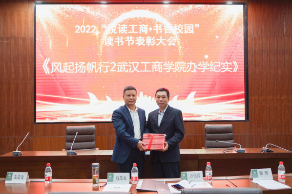 新闻中心讯(记者 万风)4月27日下午,在学校2022“悦读工商·书香校园”读书节总结表彰大会暨2023读书节启动仪式上,学校党委书记、省政府教育督导专员刘生元将《风起扬帆行贰——pg电子官方网站办学纪实》赠送给图书馆馆长万化喜。