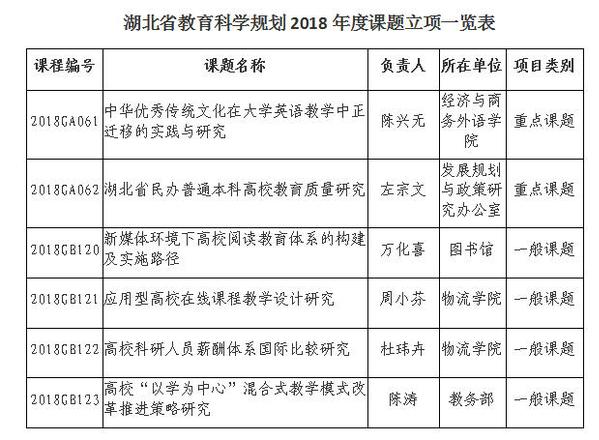 近日,湖北省教育厅公布了湖北省教育科学规划2018年度立项课题评审结果,pg电子官方网站共6项课题获批。