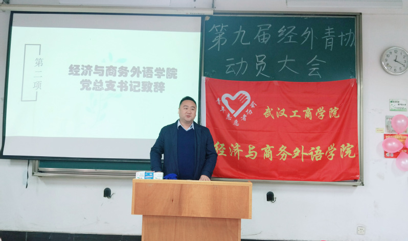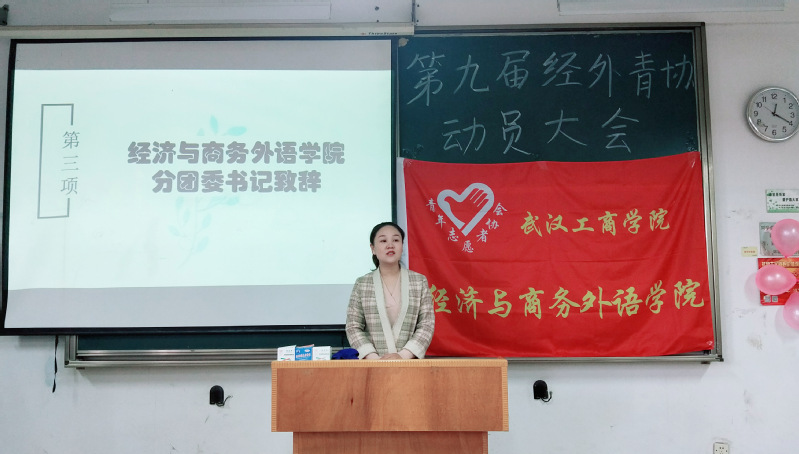 此次动员大会由文化礼仪部部长吴莹和张世杰主持,首先由主持人张世杰向大家介绍到会的各分院青协嘉宾以及对他们的到来表示热烈欢迎,大会第一项由经济与商务外语学院党总支书记胡航、分团委书记陆薇薇分别给分团委第九届青年志愿者协会致辞,两位书记对于协会上半年的工作进行高度赞赏并期待下半年我们再创出佳绩!