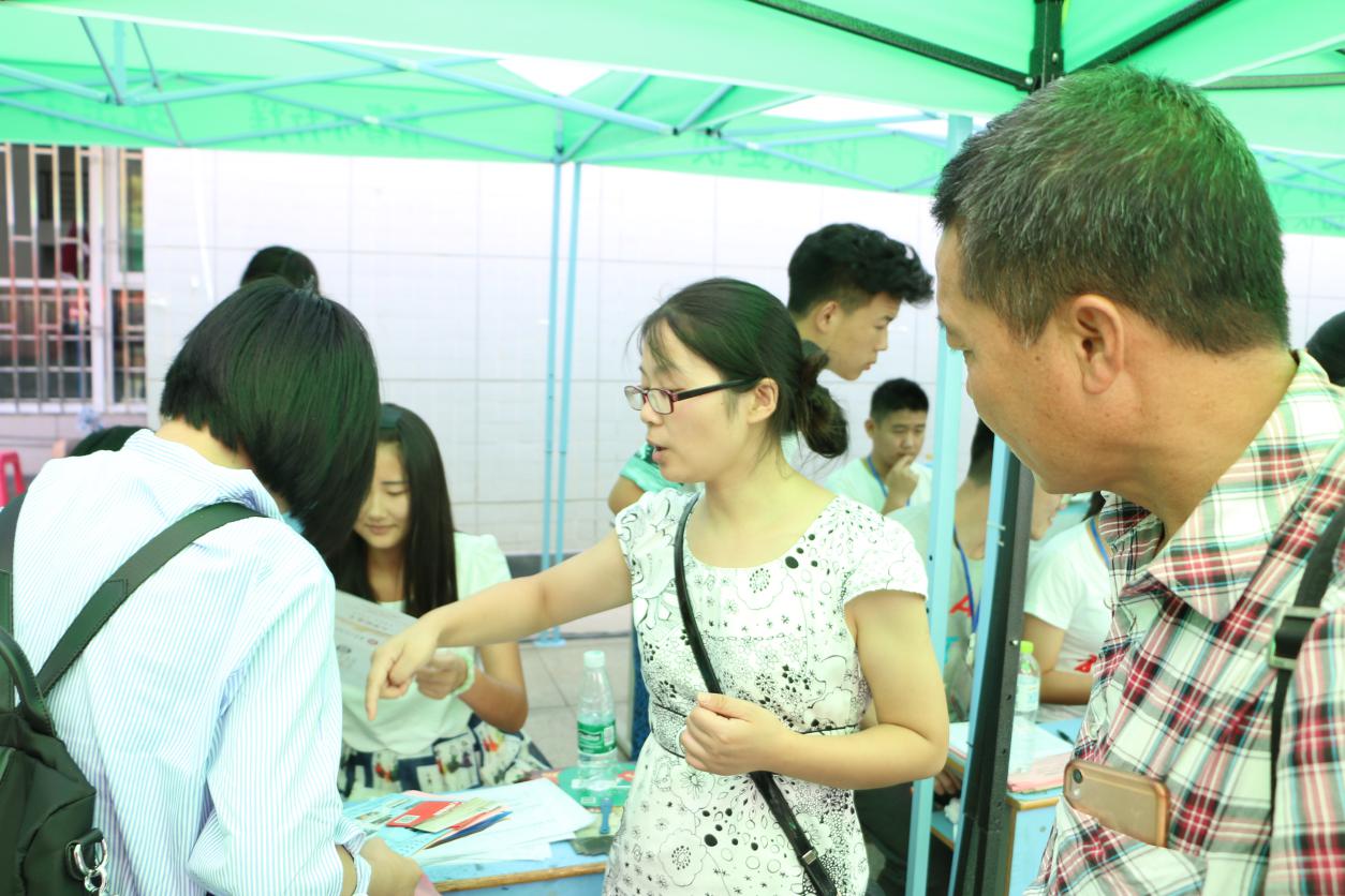 图为家长与新生学子在报道现场