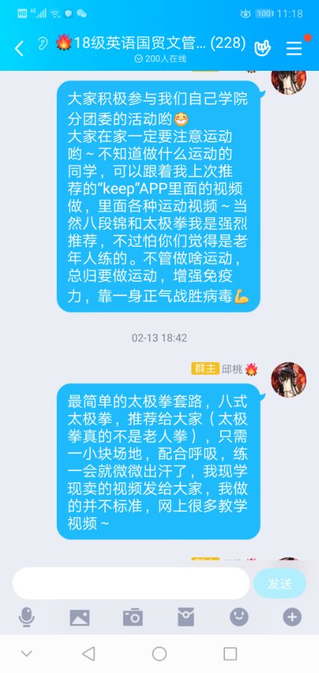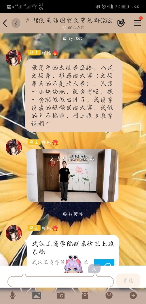 作为一名辅导员,以身作则。我自己每天运动的同时,我也运用我武术的特长录制了八式太极拳的视频发到学生总群里,同时给大家推荐好用的运动软件,提醒学生们就算在家不能出门,也要运动,提升“正气”。