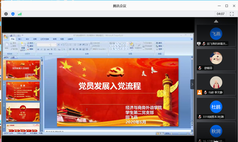 2020年6月14日晚上19:00,pg电子官方网站经济与商务外语学院第九期党校党课第七讲如期举行。经济与商务外语学院青年马克思主义研究协会邀请了党校带队老师田飞燕老师。田飞燕老师以“党员发展入党流程”为主题,给大家带来精彩的一课。