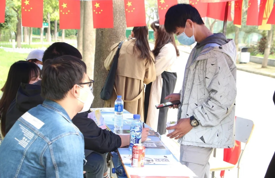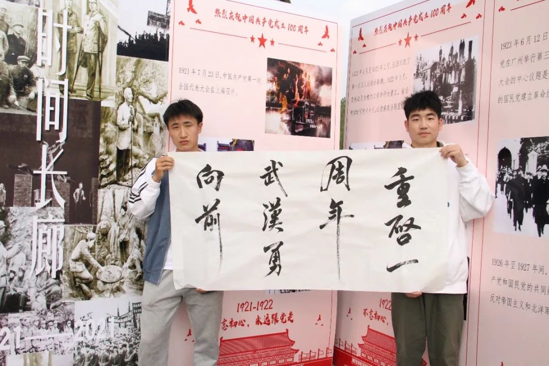 在该区域内,特设以图文形式讲述建党百年光辉历史的时间长廊,主要针对建党一百周年以来所发生的具有重大意义的历史事件。此外,现场还设立“情景再现”打卡点,还原红色场景,吸引众多同学拍照留念。