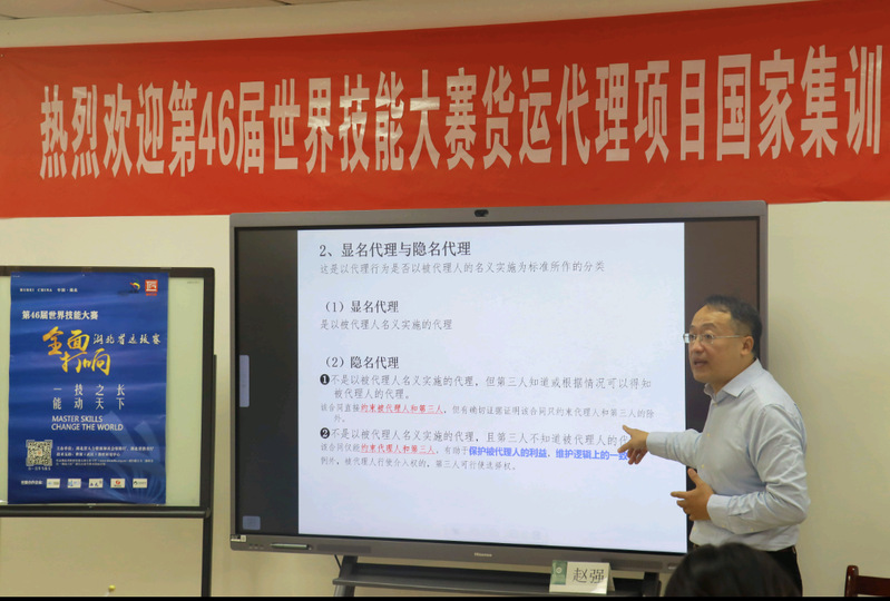 2021年11月3日上午9:00,第46届世界技能大赛货运代理项目国家集训队湖北基地集训进入第三天,由中南财经政法大学赵强教授于pg电子官方网站综合楼904讲授海上货运代理中的法律问题。