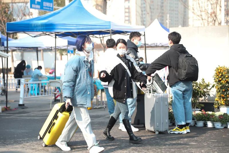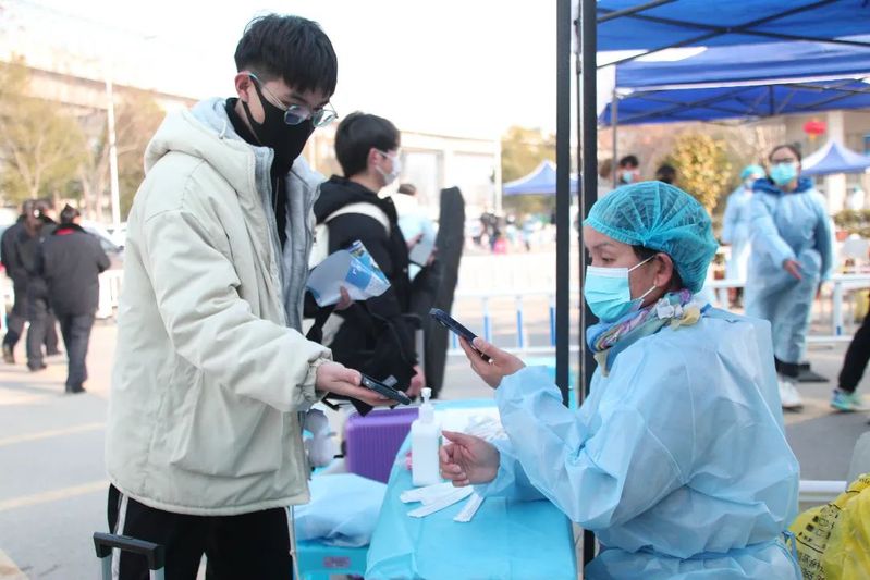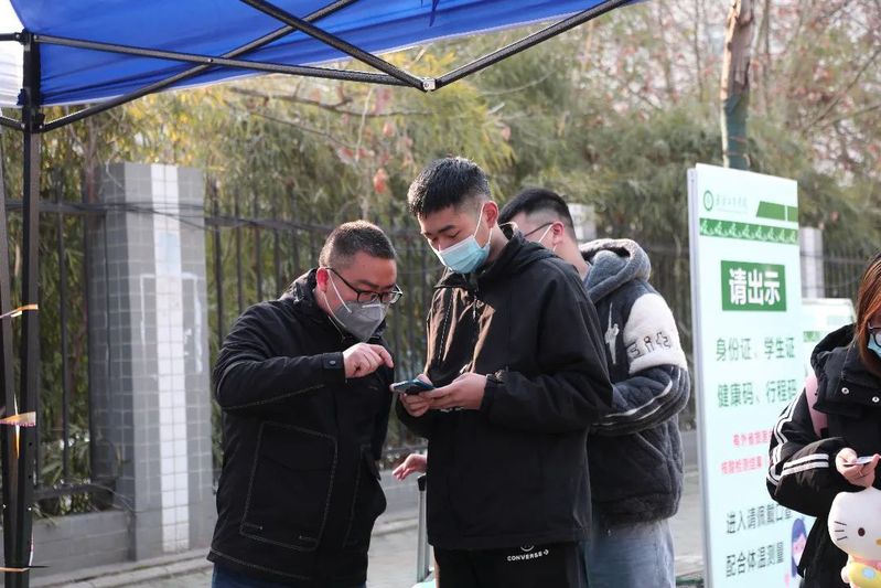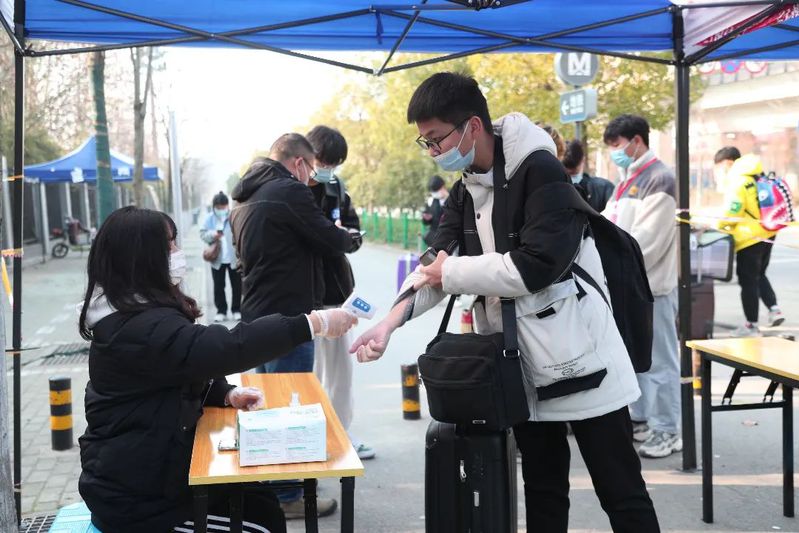 核验身份,检测体温,查验健康码、行程码、核酸证明,进行核酸检测,校门口井然有序,防疫不松懈,师生志愿者不辞辛劳,暖心服务,耐心引导,托运行李……,为学子们平安返校保驾护航。