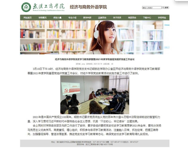 3月18日,经济与商务外语学院党总支书记胡航在学院1-904会议室召开经济与商务外语学院党史学习教育部署暨2021年度学院基层党组织党建工作会议,对经外学院党史学习教育实施方案工作进行了安排。2021年是中国共产党成立一百周年,中国共产党百年来伟大奋斗的历程和习近平总书记新时代中国特色社会主义思想,经济与商务外语学院的全体师生应对其进行全年学习,党员师生应以积极学习党史,推进学院党史学习教育,让党史学习成为教育常态化。