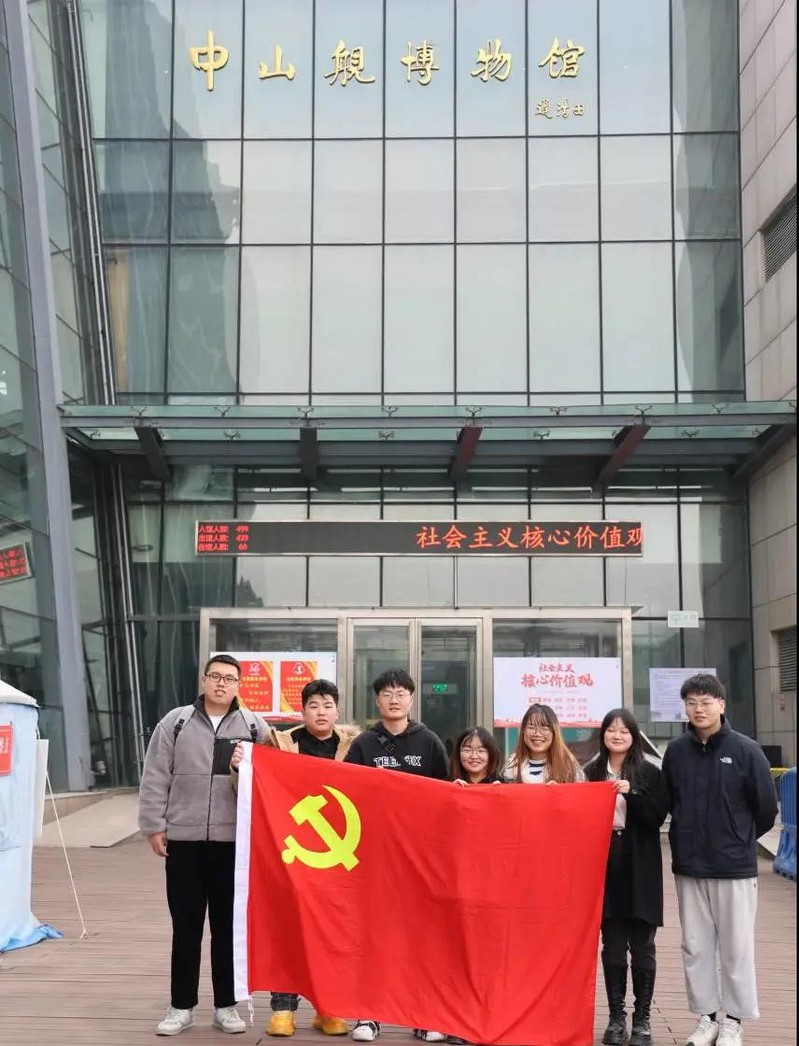 在中山舰博物馆前,参加本次活动的老师和同学们在博物馆的门口与党旗及院旗进行了合影。