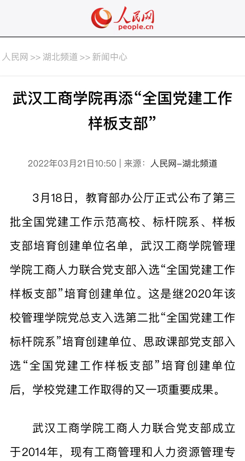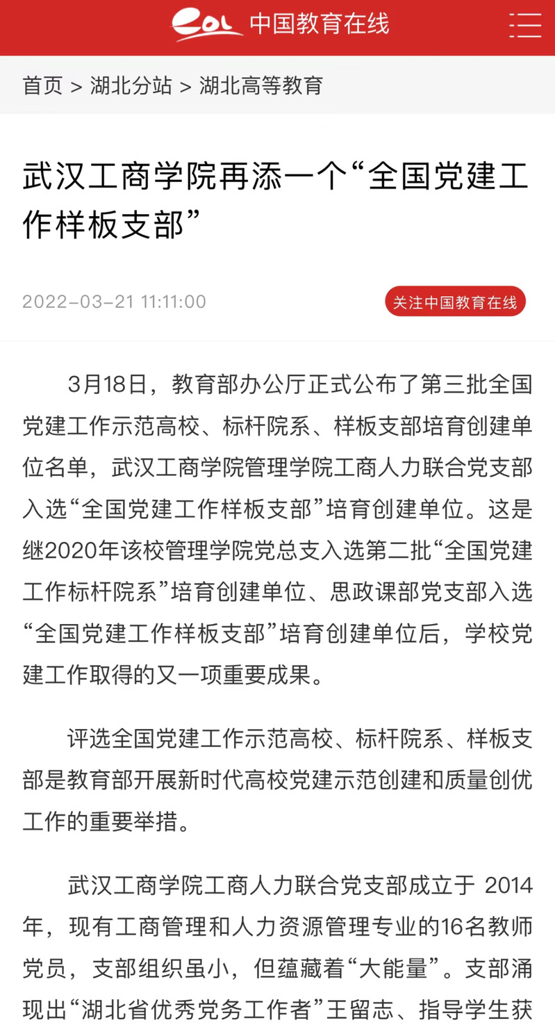 评选全国党建工作示范高校、标杆院系、样板支部是教育部开展新时代高校党建示范创建和质量创优工作的重要举措。2021年10月,教育部面向全国高校开展了《第三批新时代高校党建示范创建和质量创优工作》,学校党委高度重视,以政治建设为统领、以质量攻坚为重点、以提升组织力为关键、以推动学校事业发展为落脚点,精心组织、动员基层党组织认真总结提炼、探索创新,做好申报准备工作。在党群工作部的精心组织下,管理学院积极组织力量开展申报工作。最终经湖北省委教育工委推荐、资格审查、专家推荐、教育部党的建设和全面从严治党工作领导小组成员单位集中审议,管理学院工商人力联合党支部成功入选“全国党建工作样板支部”培育创建单位。