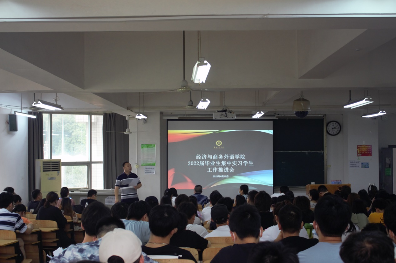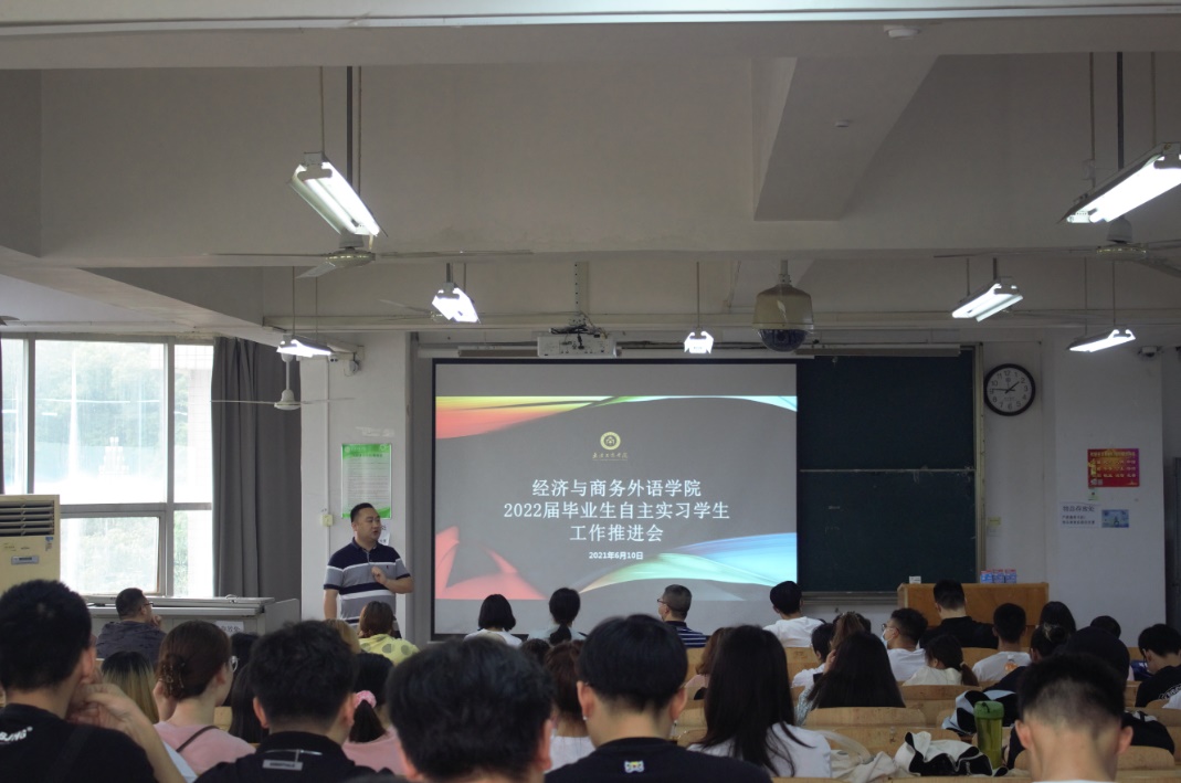 2021年6月8日下午13点,经济与商务外语学院2022届毕业生实习工作推进会在综合楼206教室召开。经济与商务外语学院副院长马洁、副院长徐良培、党总支书记胡航,办公室主任黄燕,以及2022届经济与商务外语全体学生参加了本次活动。