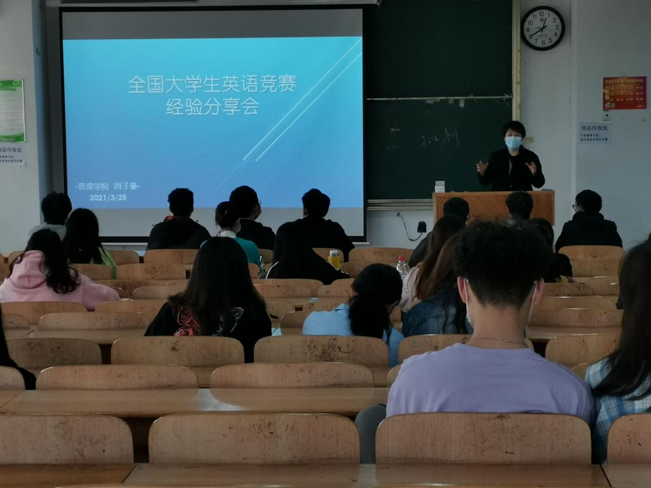 2021年3月25日下午,经济与商务外语学院公共外语系组织英语学习爱好者在综合楼206教室进行英语学习心得及参赛经验分享会。分享会由公共外语系主任黄萍主持,我校优秀的英语学习者周子豪同学作为学生代表进行学习心得和参赛经验分享。
