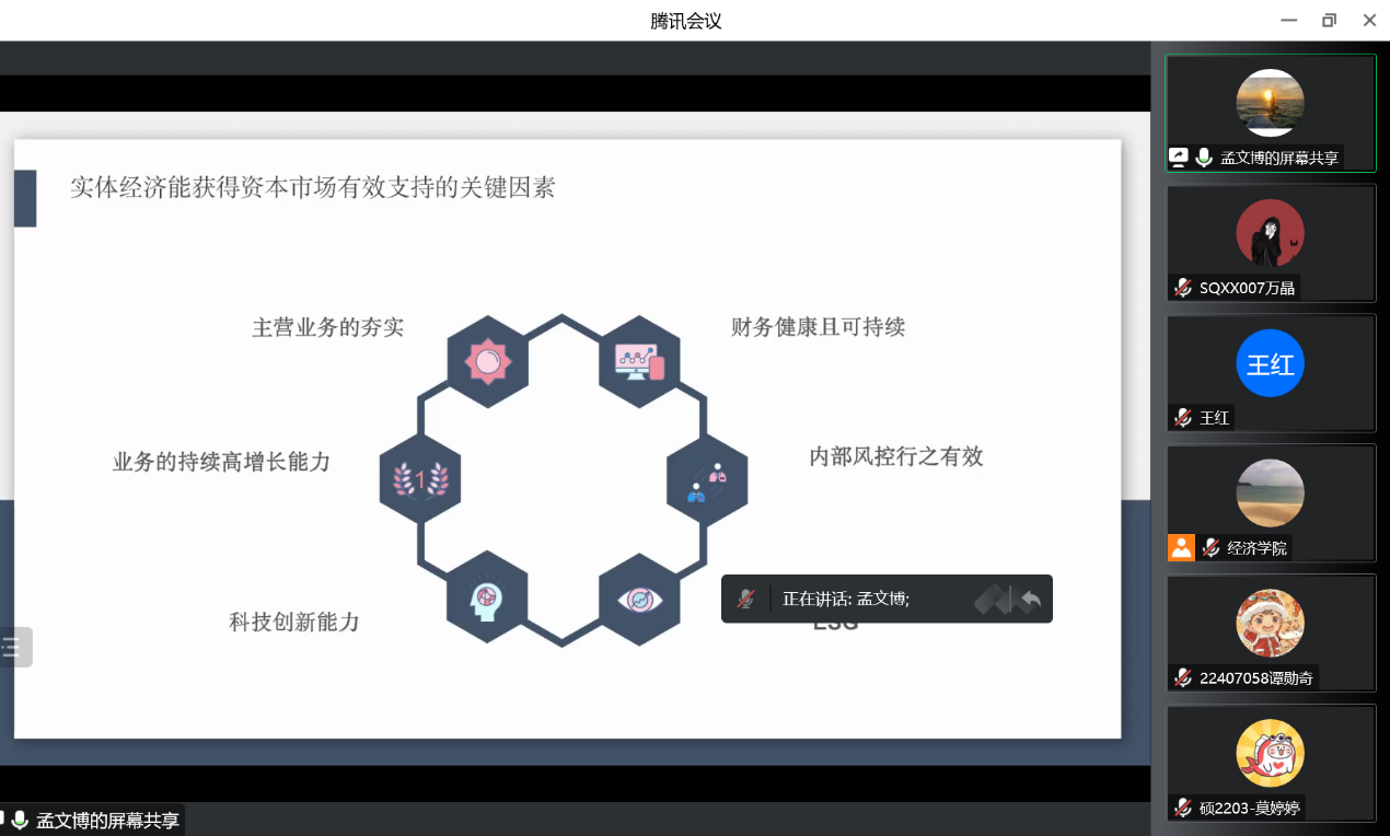 在讲座的结尾,孟文博也谈到了他对资本市场支持实体经济发展的几点思考:第一,资本市场的蓬勃发展,一定能够助力中国优秀企业实现更加稳健、更加持续的成长;第二,坚定不移的持续、健康发展中国资本市场,让资本市场为实体经济发展带来持续、健康助力与动力;第三,实体企业需要善于且有克制的积极对接资本市场;第四,能够长期利用好资本市场的实体企业,大多自身战略清晰、业务坚实、财务健康、管理有序。