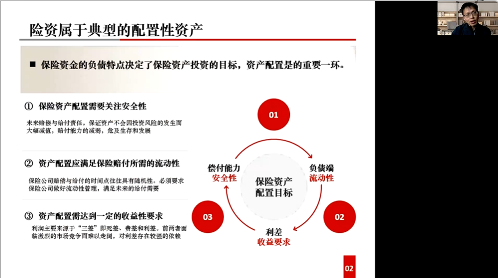 由保险资金的负债特点出发,曹云祥指出在保险经营的目标实现中,资产配置是非常重要的一环。首先保险资金需要关注安全性,也就是关注未来赔偿与给付责任,保证资产不会因投资风险的发生而大幅减值,导致赔付能力的减弱而危及保险公司生存和发展;其次资产配置应满足保险赔付所需的流动性,因为保险公司赔偿与给付的时间点往往具有随机性,必须要求保险公司做好流动性管理,满足来来的给付需要;最后资产配置需达到一定的收益性要求,保险公司利润主要来源于“三差—死差,费差和利差,从我国寿险业来看,死差和利差面临激烈的市场竞争而难以走阔,利润来源较强的依赖利差贡献。基于此,曹云祥认为为实现保险投资的目标,应该坚持三大主要原则,收益匹配原则,久期匹配原则,“三性兼顾,安全第一”原则。 其中,“三性兼顾、安全第一”原则指收益性、流动性、安全性的恰当匹配,并且把风险管理放在首位。