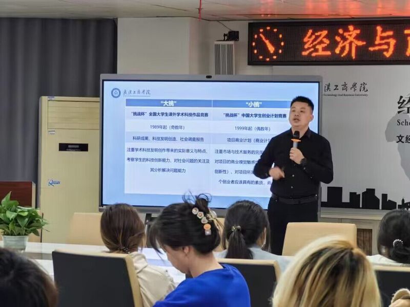 在答疑环节,同学们踊跃提问,邱玉添书记一一解答。他耐心地回答了同学们关于比赛项目选择、团队组建等方面的问题,为同学们提供了宝贵的指导和建议。指出参加比赛并不一定要有完美的创业计划和团队,只要有想法和激情,就可以组建团队,深入挖掘自己的创意,并通过比赛的锻炼和反馈,不断完善和提升自己的创业能力。