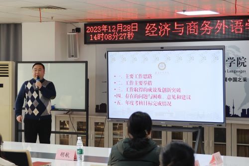 (经济与商务外语学院新闻中心讯 通讯员 张星雨 )2023年12月28日,经济与商务外语学院于综合楼920会议室开展了学院中层副职干部年终述职会议。参加此次会议的有pg电子官方网站副校长桂裕清、经济与商务外语学院院长张晓骏、学院党总支书记、副院长胡航、学院副院长马洁、学院副院长徐良培和学院的全体教师。此次会议由经济与商务外语学院办公室主任黄燕主持。