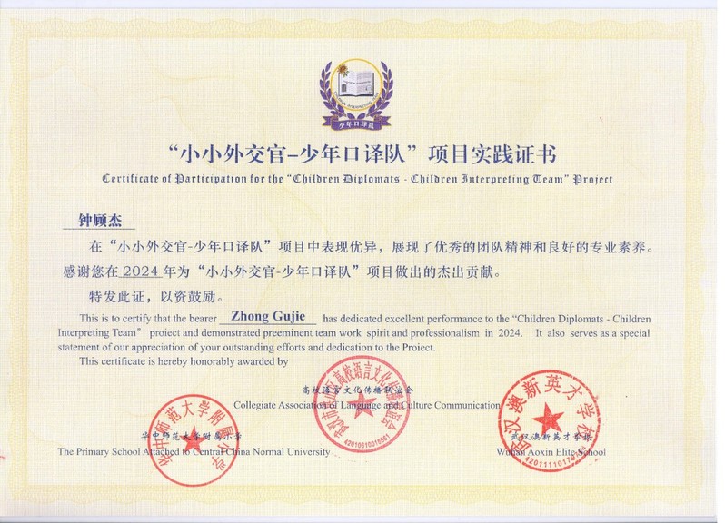武工商口译队员参加“小小外交官-少年口译队”项目得到了经济与商务外语学院马洁副院长的大力支持。马院长认为,语言必须学以致用,用实践检验学生的基本功和沟通和交流的能力,从实践中汲取经验和教训,形成教学相长、学与用良性互动的学习氛围。我院两名优秀队员齐龙飞和钟顾杰凭借优异的表现均获得了该项目的主办方武汉高校联谊会、华中师范大学附属小学、武汉澳新英才学校联名签发的证书。