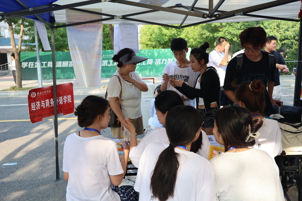 图为经外学院分团委书记徐可老师以及分团委志愿者为新生答疑解惑
