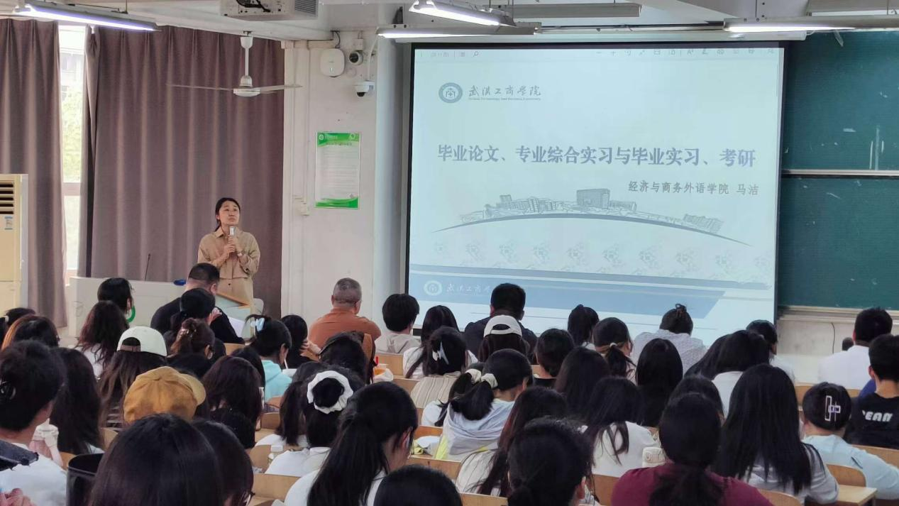 经济与商务外语学院新闻中心讯(记者:杨萌)毕业实习是青年学子们迈向职场的重要准备阶段,为了确保大家能够顺利开启这段征程,4月17日13:00,经济与商务外语学院在综合楼307教室召开2026届毕业生考研、实习就业工作动员推进会。出席此次动员推进会的有经济与商务外语学院党总支书记胡航、副院长马洁、副院长徐良培、院长助理吴红艳、金融与保险系系主任崔译文、副主任夏崧崧、国际经济与贸易系主任周国洋、数字经济系系主任高燃、专业外语系系副主任郑鹰、辅导员田飞燕、杨情老师、实习工作负责老师张子菡、何香香以及经济与商务外语学院2026届全体学生。