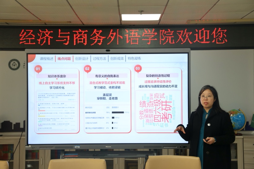 在研讨会第一阶段,黄净主任系统阐述了“五自”质量文化的内涵,强调其以成果导向教育(OBE)理念为引领,致力于构建全员参与、持续改进的教学质量保障体系。随后,她对陈燕琴教授在英语教育数字化、课程思政与教学创新领域的突出成就进行了介绍。