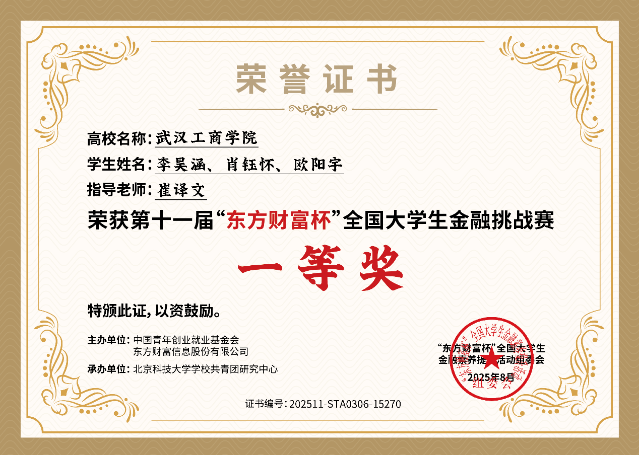 经济与商务外语学院新闻中心讯(记者:于昊阳)8月22日,第十一届“东方财富杯”全国大学生金融挑战赛全国总决赛圆满落幕。我院学子凭借扎实的金融专业功底、出色的团队协作能力与敏锐的市场分析眼光,在全国众多参赛队伍中脱颖而出,斩获全国一等奖1项、湖北省一等奖1项、湖北省三等奖2项,比赛成绩取得新突破。