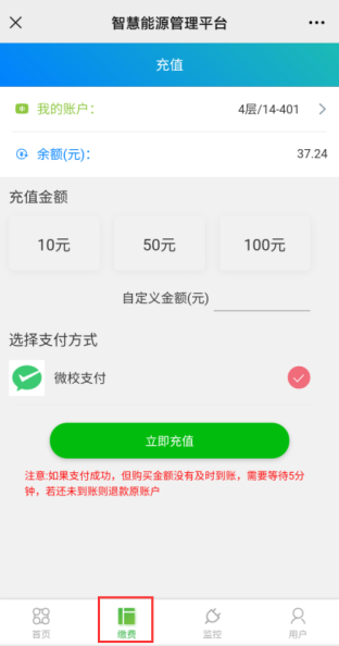 四、在“电子校园卡”应用点击“自助购电”;绑定寝室号;检查“用户”信息是否正确;点击“缴费”完成线上购电。