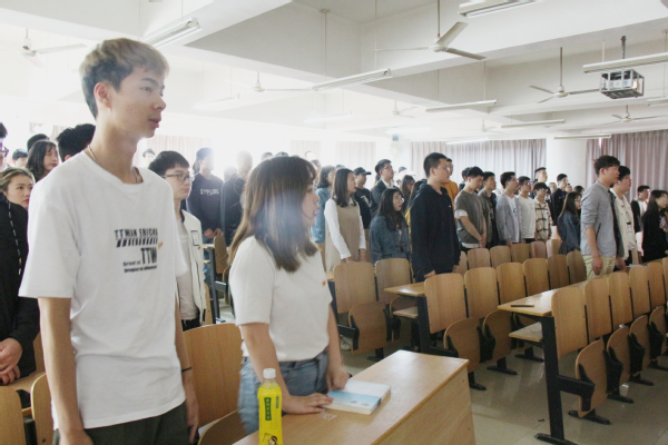 图为全体师生起立奏唱国歌 摄影:邓太莎