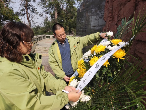 学院分工会主席张静老师和教工第三党支部书记一同向革命烈士敬献花圈并整理缎带,全体教职工依次为烈士墓献花并深深鞠躬,寄托对革命先烈的悼念与致敬。