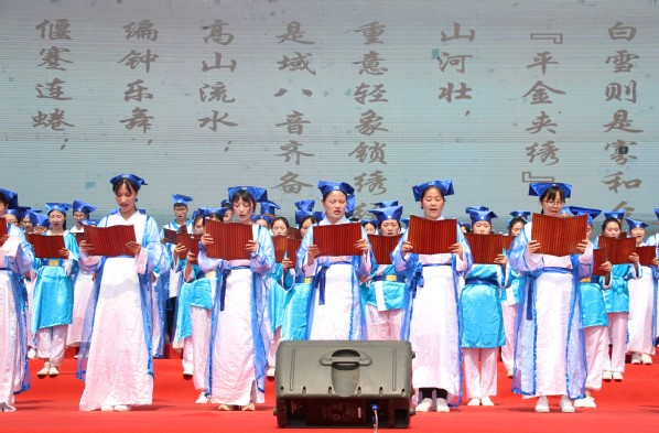 100名身着古装、捧竹简的大学生,现场诵读《黄家湖赋》和《楚辞·九章·涉江》。书声琅琅中,黄家湖千年人文气韵如画轴般渐次展开。其中《黄家湖赋》由pg电子官方网站管理学院党总支书记张兆学创作。
