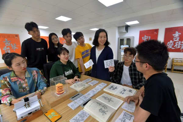 图为学校艺术与设计学院老师正在向学生介绍“字绘中国”创业项目