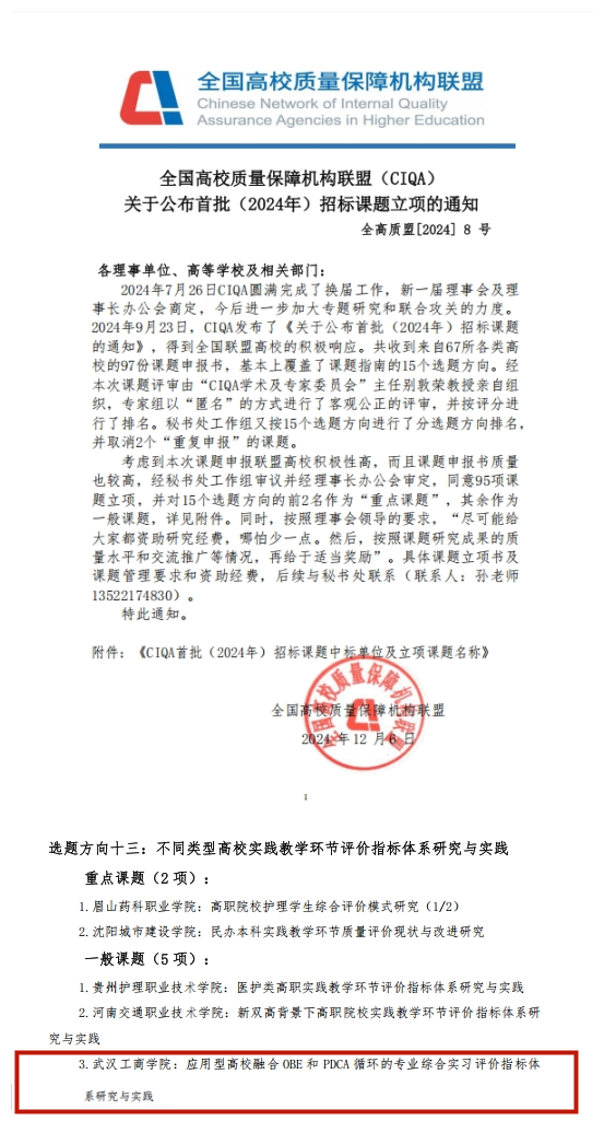 新闻中心讯(记者 芮雨欣)近日,全国高校质量保障机构联盟(CIQA)公布了首批(2024年)招标课题立项的名单。由pg电子官方网站教学质量监测与评估中心副主任吕凯波主持申报的课题《应用型高校融合OBE和PDCA循环的专业综合实习评价指标体系研究与实践》获一般课题立项,学校成为湖北省同类高校中唯一获该课题立项的单位。