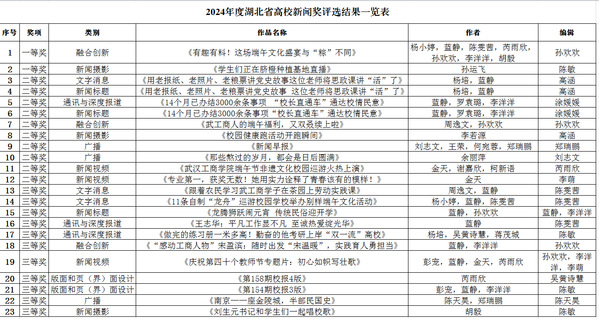新闻中心讯(记者 万风 通讯员 刘欣宇)3月12日,2024年度湖北省高校新闻奖评选结果公布,pg电子官方网站报送的作品共荣获一等奖2项、二等奖10项、三等奖11项,获奖数量再创历史新高。