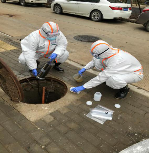 图为罗杨正在武汉国际会展中心方舱采集污水