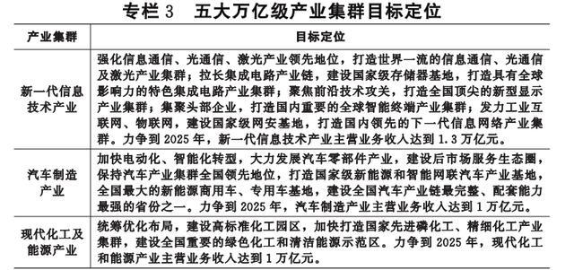 (一)培育壮大战略性新兴产业。围绕“51020”现代产业集群,对每个产业集群实行“一张产业地图、一个实施方案、一位省领导领衔、一个专家团队跟进、一套工作专班服务”的“五个一”工作机制。开展产业链精准招商,加快提升4个国家级战略性新兴产业集群综合竞争力,新增8个以上省级战略性新兴产业集群。打造世界一流的“光芯屏端网”等新一代信息技术产业,建成全国领先的汽车制造、现代化工、大健康、航空航天产业基地和现代农产品加工新高地。加快482个亿元以上重大新兴产业项目建设投产,高技术制造业增加值增长15%以上。