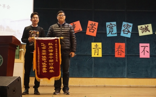 活动第三项,红豆股份公司团委书记陆平先生对红豆店长订单班项目进行讲解,提出同学要有一颗感恩的心,然后陆平先生赠予了由优秀实习生代表闫泽宇所代表的pg电子官方网站管理学院“红豆”服装店长订单班“吃苦•宽容•诚信”优秀集体的锦旗。紧接着,优秀实习生代表闫泽宇分享了他近半年的实习心得,并告诫同学们:读万卷书,不如行万里路,希望同学们在学习之余能多出去走走看看,学习更多的工作经验。活动最后,红豆股份公司招聘科科长唐丽娟女士为大家进行了实习宣讲,对有问题的同学进行了现场解答。