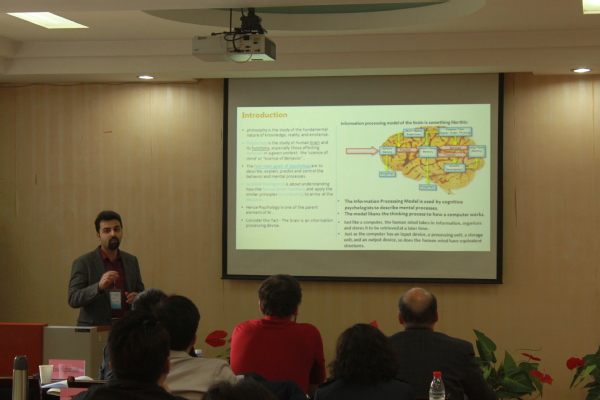 叙利亚蒂什伦大学教师、武汉理工大学博士Essa Alghannam围绕人工智能心理学和哲学之间的关系展开交流,他从人和机器人的认知功能、心灵、头脑、语言等方面介绍人和机器人之间的交流和情感表达。他说:“如果我们可以说电脑就像我们的大脑一样工作,这意味着谁创造了电脑,谁就拥有和谁创造了我们的大脑一样的思维方式。”