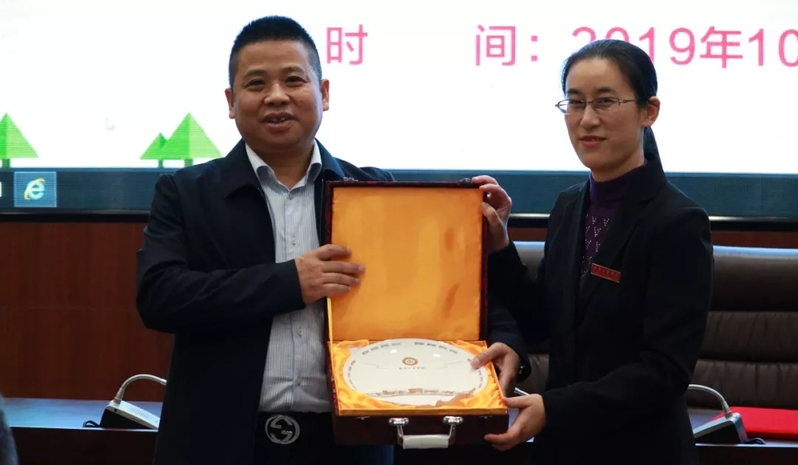 图为物流学院党总支书记蔡菁向顺丰湖北区副总裁赠送学校纪念品 摄影:叶炫志