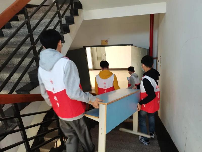物流学院青年志愿者协会全体成员7:20在二食堂门口集合,分组搬运物资。