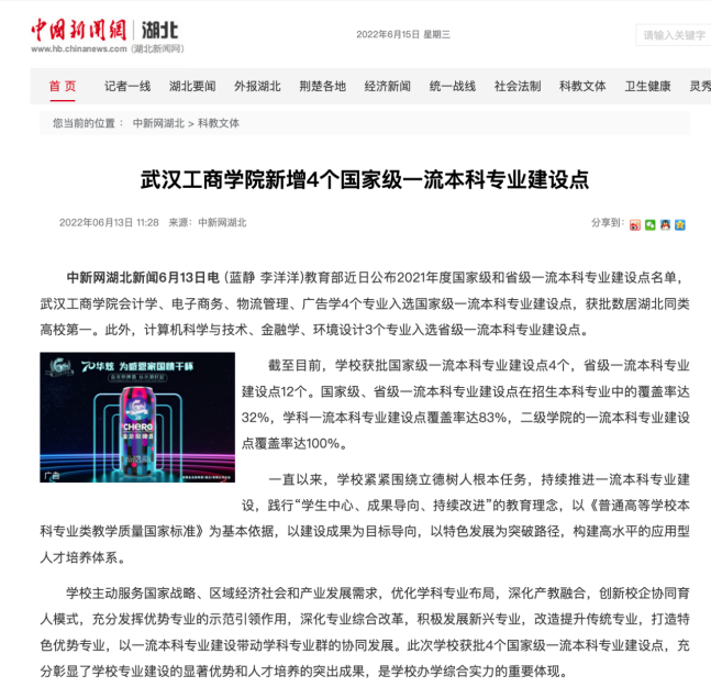 近日,教育部公布了2021年度国家级和省级一流本科专业建设点名单,pg电子官方网站物流管理专业入选国家级一流本科专业建设点。该新闻分别被人民网、新华网、中国教育在线、中国新闻网、湖北教育电视台等媒体报道。报道新闻如下: