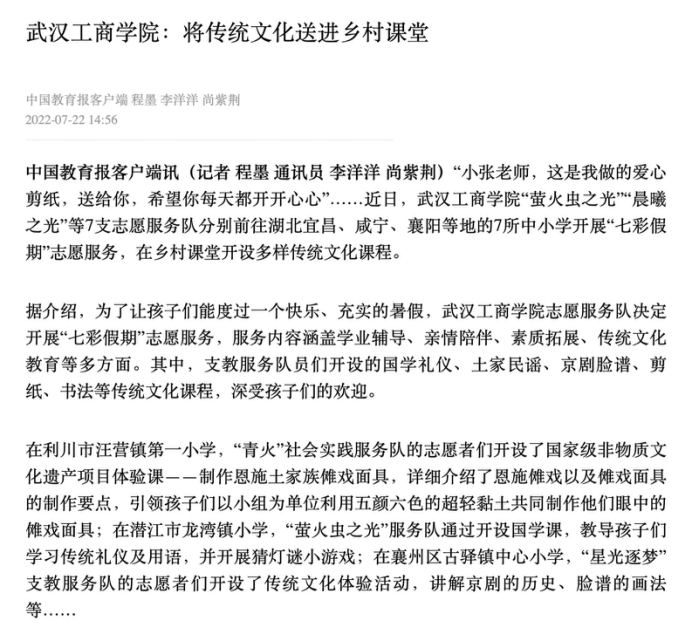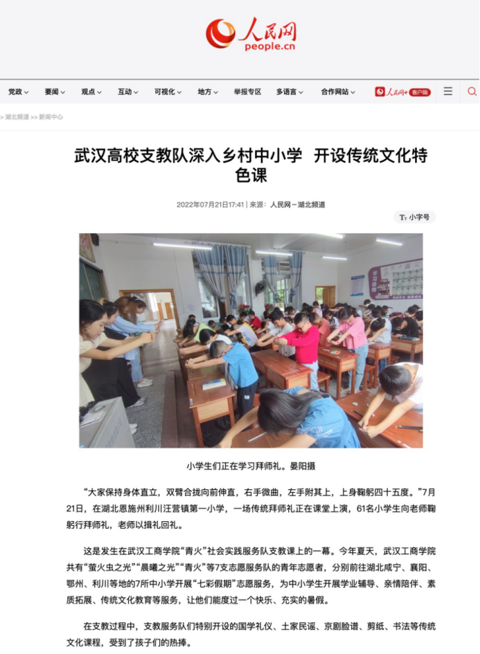 为深入学习习近平总书记在庆祝中国共产主义青年团成立100周年大会上的重要讲话精神,聚焦未成年人保护和青少年健康成长,以实际行动迎接党的二十大胜利召开,pg电子官方网站物流学院“青火”社会实践服务队作为共青团湖北省委“七彩假期”志愿服务团队之一,7月11日来到利川市汪营镇第一小学,开展为期15天的“七彩假期”志愿服务活动,物流学院党总支书记蔡菁、分团委书记章姗带领物流学子们与汪营镇第一小学的学生们一起度过一个充实多彩的假期。该新闻被人民网、湖北日报、中国教育报,多家媒体转载,详细新闻如下: