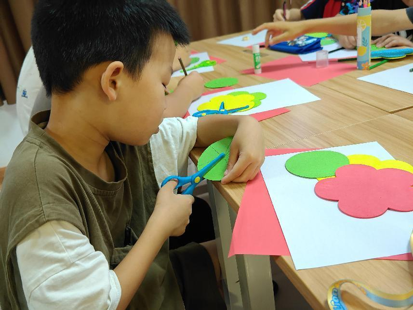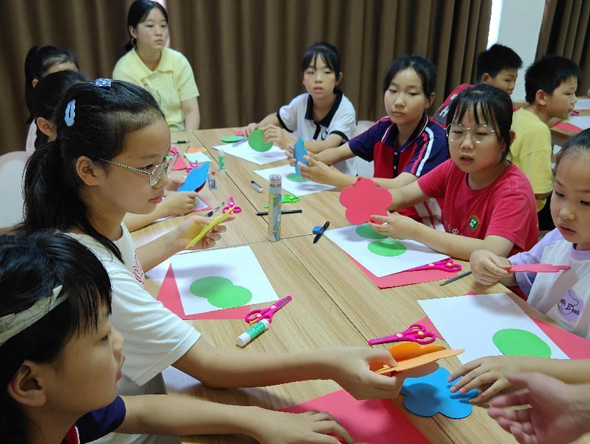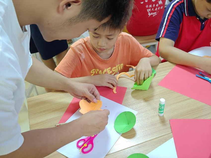 志愿者们耐心地教小朋友画图、裁剪、折纸,小朋友们兴趣十足,边看边学边动手,忙得不亦乐乎。