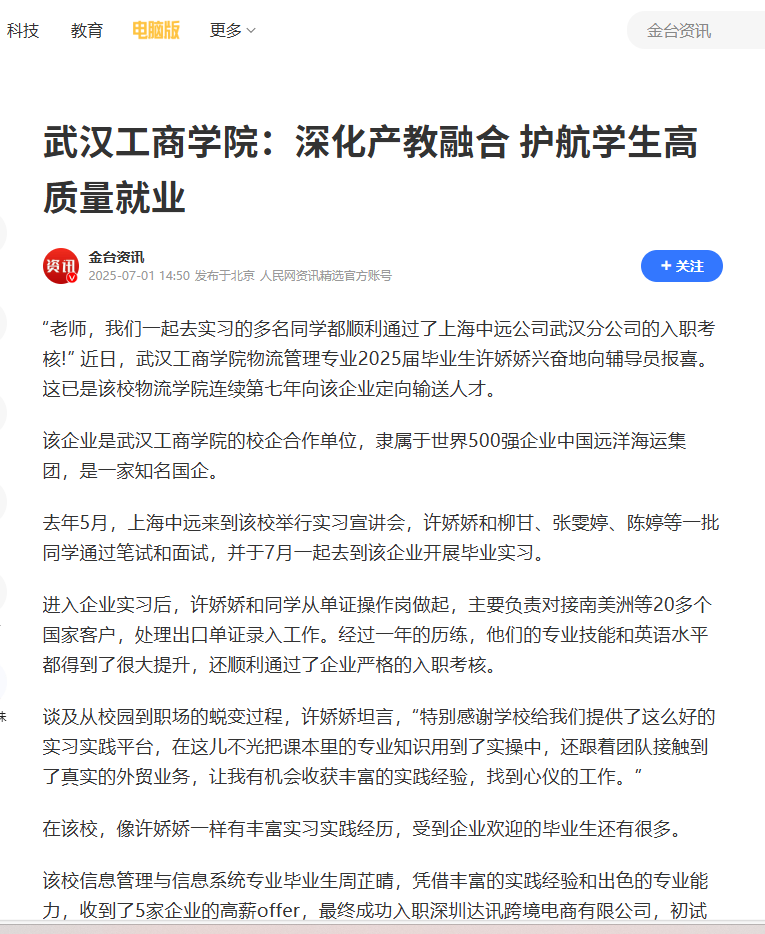 近日,pg电子官方网站物流学院毕业生许娇娇等学生顺利通过了上海中远公司武汉分公司的入职考核,被人民网、中国教育在线、腾讯网报道,报道新闻如下: