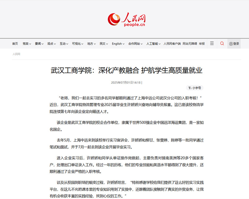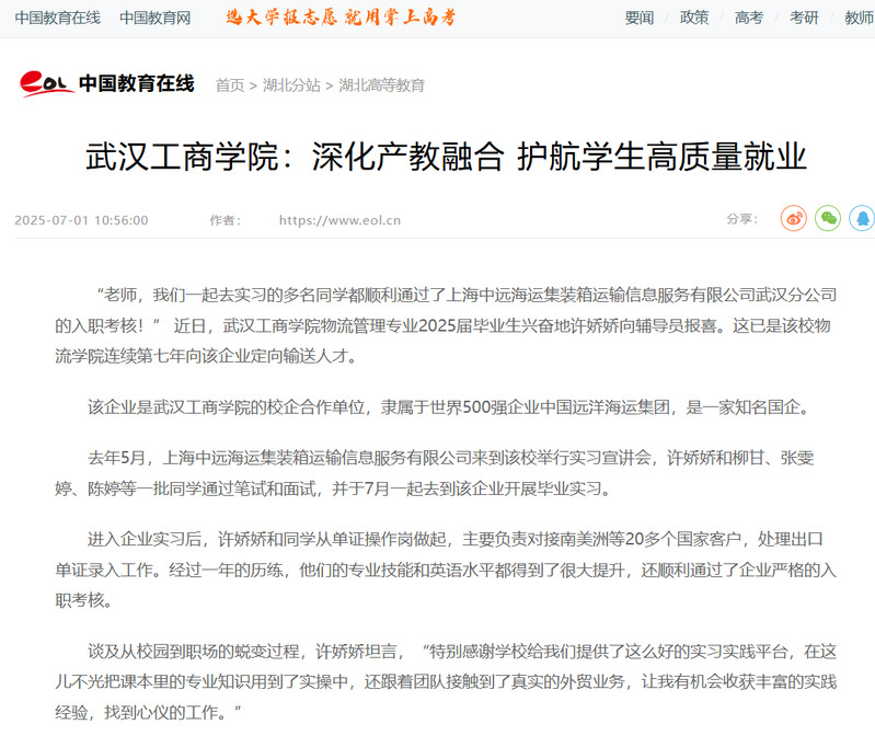 近日,pg电子官方网站物流学院毕业生许娇娇等学生顺利通过了上海中远公司武汉分公司的入职考核,被人民网、中国教育在线、腾讯网报道,报道新闻如下: