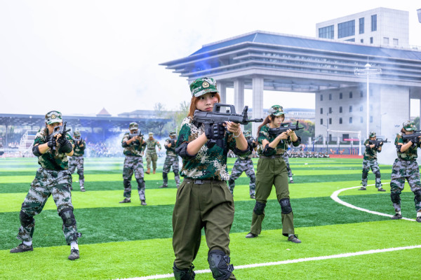 压轴登场的是战术方队。他们目光坚定,手持“钢枪”,在模拟的战场硝烟中,进行了一场融合战术队形变换与基础战术动作的实战化演练。队员们行动敏捷,配合默契,冲锋、掩护、搜索、突击,每一个环节都紧张逼真,展现出了良好的战术素养和团队协作精神,赢得了现场阵阵热烈的掌声。