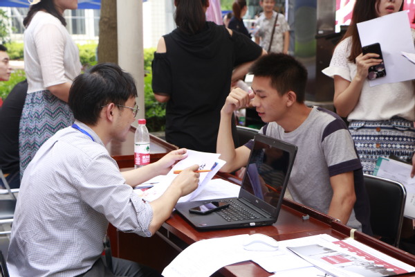 记者在现场看到,不少同学在双选会上表现得十分紧张,担心自己的简历不够完美会被用人单位拒绝。“同学,不用紧张,你先放轻松。”武汉立璋教育有限公司的一名负责人对面试的女生轻声说到。不过也有很多同学心态平和、目标明确,大三学生郑勇告诉记者:“我想应聘杭州源亿科技发展有限公司,这个公司和我所学的专业十分对口,而且符合我的职业规划,希望我的表现能让他们满意。”
