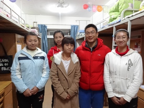(图为工学院大一辅导员熊大建老师和女生宿舍的学生留影纪念)
